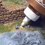 | 8. | I painted this rock exactly the same way I paint the buildings. I started with a thin mixture of dark gray underneath, a medium shade of gray brushed on with medium pressure, and then a light gray dry-brushed on top of that. The rock mold gives you the details and random shape of real rock which makes for a nice effect. The next time I do this, I will make the rocks look like they are embed into the hillside, rather than sticking out of the hillside. |