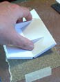 | 9. | You can use cardboard, but for this roof, I'm going to use foam core board. It's a layer of foam between 2 layers of paper. It's very stiff, light and easy to cut. You can find it at most craft shops. Lay the roof template over the board and push on each corner with a pencil or ball point pen. Remove the template and connect the dots using a ruler. Don't forget to do the same thing for the triangular roof braces. |