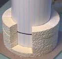 | 1. | To build the tower, you will need 12 castings of the turret mold #61. You will also need 4 castings of the slate conical roof mold #87. We'll start with the base of the tower. Glue the first layer of blocks down to a piece of cereal box. Be sure that one of the outside blocks is a flat one (for the threshold of the doorway). |