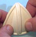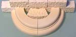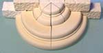 Making a balcony is very similar to making a corner turret. The only thing different is how to brace the underside. The pieces shown here are upside-down so you can see how the underside of the balcony is built. Start with 2 of the large smooth curved sections. Place a regular curved piece inside to act as a brace. Next you'll need 4 of the smaller smooth slices put together to form a half circle. Place these on top and glue them to the brace block and against the wall. Finish the decoration by sanding a knob piece in half and gluing it against the wall. |