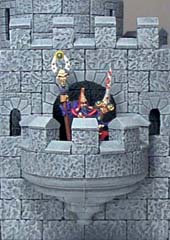 | 5. | Here's a photo of the finished turret. The miniature was made by Games Workshop. There are lots of possibilities for this thing. The turret could have extended further down into the first floor and included a window, we could have added the dome to the top, or the turret could reach all the way down to the base. Also, these turrets could attach to a flat wall (half circle), or they could be on an inside corner (quarter circle). They also make great circular staircases using the flat tiles as steps. |