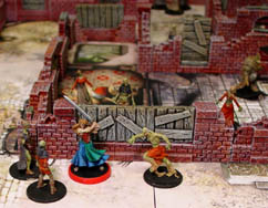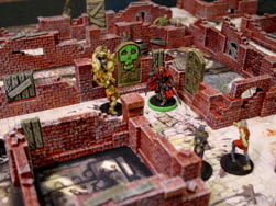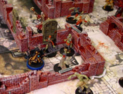 Here are several photos of the walls set on top of the Zombicide game board tiles. I borrowed the painted miniatures from Knight Watch Games who were kind enough to lend them to me. Click on the photos to see a larger version of each. |