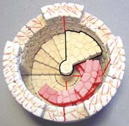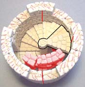 | 14. | Flip it over and glue it on top of the tower in the position shown (don't glue it to the stairs!). Glue another ring of blocks around to form row 9. Also glue one step section to the floor and the wall. I placed marks on the top to remind me not to glue the next row down. I want the tower to come apart here for easy painting. |