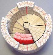 | 12. | The decorative doorway top is made by gluing the teeth and 1/4 round blocks as shown. Do not glue this to row 7 (shown in blue)! Remember, this row belongs to a section that will lift off later on. The main block of the decoration will glue directly onto row 6. |