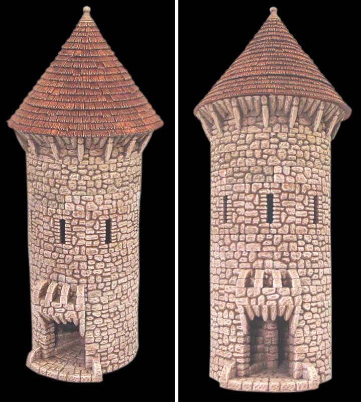 | 5. | After painting all the pieces, glue the roof to the top of the tower. The roof will be permanently attached to the tower top but the tower top will lift off of the rest of the tower so you can see inside. For instructions and colors used to paint the tower, refer to the Earth Tone Painting Instructions page. For instructions on painting the wood shingle roof, visit our Conical Roof Painting Instructions page. Click on the photos for a larger view of the tower. |