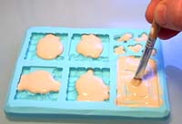 If you don't use the "wet water" method, then you will have to use a brush on mold #266. Start by pouring a small amount of plaster into each pocket of the mold. Next use a stiff bristled brush to paint around inside the mold. Tap or jar the mold occasionally to bring air bubbles to the surface. Wash the brush out immediately and fill the pockets the rest of the way with plaster. Acid brushes work well and are very cheap. You can find them at most hardware stores where solder is found. These brushes are used to apply flux to solder joints and are less than $1 each. |