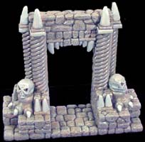 12. | Glue 4 halves of the long twisty columns onto each side of the doorway. Add the 2 skulls (on top of the dragon feet) and add 4 sets of short teeth also. Place the arch (from the step above) across the top of the doorway and add 4 pieces of teeth to decorate the top. |