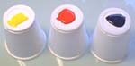 3. | Paint no more than 3 tiles at a time! If you try to paint more than this, the paint will dry and not blend correctly. Be sure to have a cup of water on hand so you can clean out your brush quickly. Paint the thin yellow into the first three squares and use a lot of paint! We don't want it to dry before we can mix it. Dip your brush into the red and paint it around the edge. The paint should start blending as you put it down. When your brush starts filling up with orange paint (from it mixing), clean it out quickly and continue painting the red. If you want your colors to blend more, simply dab the brush around closer to the center yellow. Since the red will have a tendency to take over (being the dominant color), clean your brush and add more yellow paint to the middle of the lava. |
