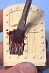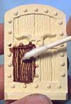 7. | There are several ways to paint the door. The most common way is to mix up some thin brown paint (artist acrylic works best), paint it on a panel, and immediately wipe it off with a Q-tip. Be sure to test your paint color on a spare or miscast door first! Once the panels are done, paint the outside frame solid black. |