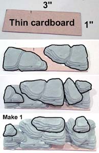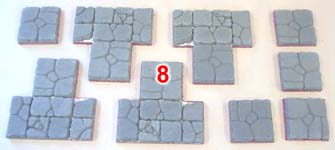13. | To make the barricade, glue the four tiles shown down to a piece of thin cardboard or cereal box. Glue the three 1" long flat tiles down to the center and on edge. Add a pillar on each end and then evenly space out 5 small bricks on top. Add the wooden planks after the piece has been painted. |