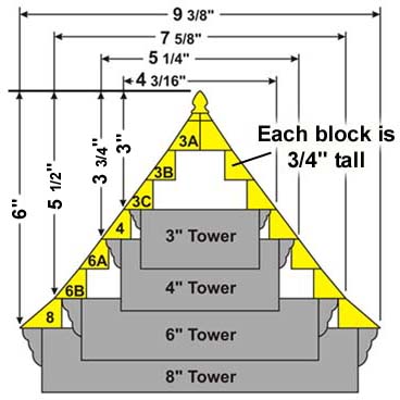 All of the blocks are clearly labeled on the sides. The number on the side of the block refers to the diameter of the ring it will make. In other words, the block labeled "8" will be the final ring used in a roof for an 8" tower. The block labeled "3C" would be the final ring used in a 3" round tower.