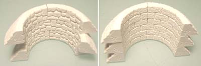 | 4. | On some rows, especially the bottom of the 8" row, you will notice a gap between two blocks. All of the other blocks on that ring will fit well except in one place where the ends connect. On the wood shingle blocks this is not a problem because you will not see the gap because of all the vertical lines from the wood texture. However, on the slate roof you will need to fill the occasional gaps between blocks to give a seamless effect. |