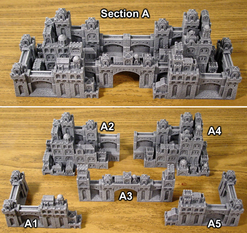 The reason this will happen is that all of the castle cubes are intentionally made slightly smaller (10/1000") because they were originally meant to be used for a castle cube stacking game. In this game, small groups of cubes would be grouped and painted. Since paint takes up thickness on all sides of the cube, they would have been too tight to stack and remove when planning these cubes with other Hirst terrain. Also, I thought it unlikely these cubes would be stacked in lines covering long distances. However, the castle walls and towers are meant to be stacked in lines to cover long distances so they are more precise in size, therefore slightly longer than the cubes when lined up. This difference in size will not affect the display. The wall that extends out will simply meet up with a side tower and the small gap will be hidden down beneath the structure when the whole thing is assembled. |