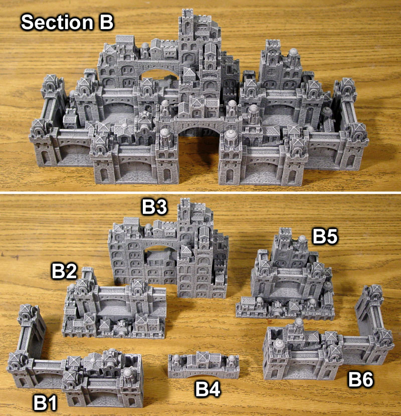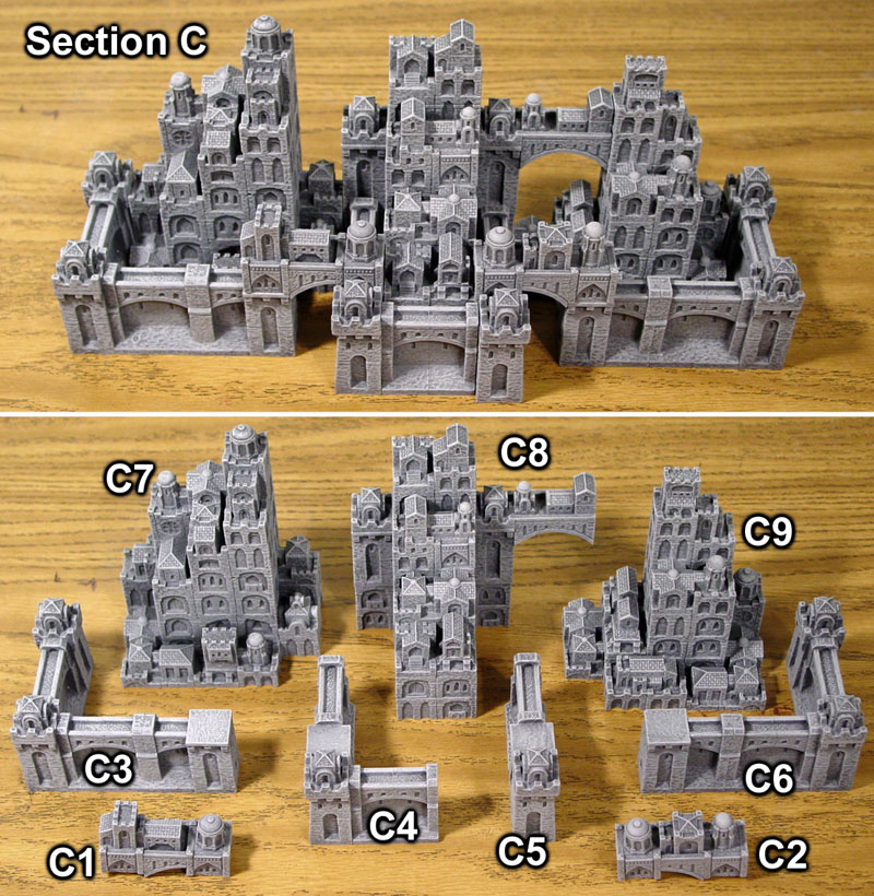 | 2. | The photo below describes how the pieces from each mold will be identified. Cube blocks from mold #370 will not be labeled. Decorative top buildings from mold #371 will be identified by their number, which can be found on the PDF guide above. Tall wall blocks from mold #372 will not be labeled. Towers and tops from mold #372 will be labeled with a letter. |