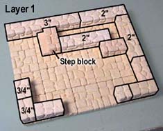 | 4. | After you glue the last level on, you may also want to chip the edge of the angle blocks with pliers. If you don't, the blocks will make the opening a little smaller than a hallway section and might look odd. Here's a photo of the finished staircase. It can be used as an entrance into your dungeon, or as a way up to the next level. |