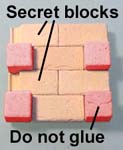 3. | These photos show how to make the door. Do not glue the blocks in red. These are just used as temporary spacers. The blocks on the left are secret door blocks. Glue the panel on top. When dry, remove the spacer blocks. |