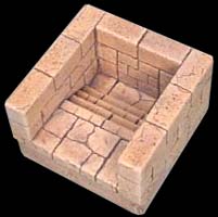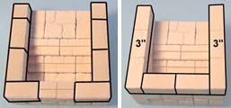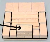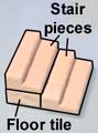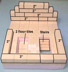 2. | Glue the stair pieces onto the floor tiles. The center block is made using bricks from mold #291. If you do not have this mold, simply glue two 1" square floor tiles back to back. Glue it in place and add the other wall blocks. |
