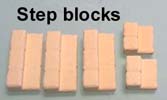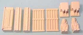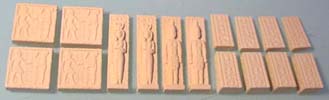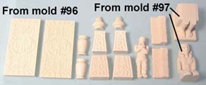 1. | Collect the pieces shown here from mold #96 and mold #97. The only pieces needed from mold #97 is the sitting statue. Glue the stair blocks onto a 1" x 1/2" floor tile. |