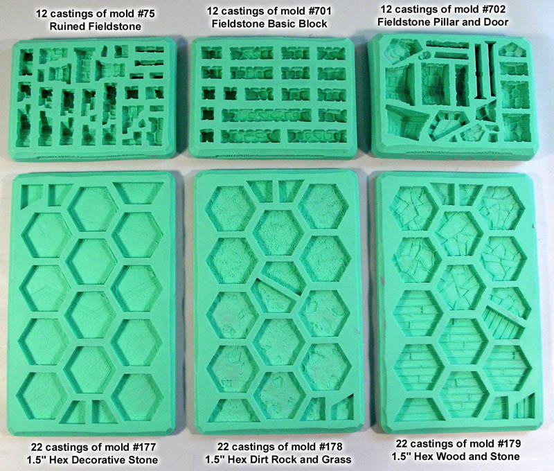 | 24. | The ruined blocks on the hex pillar mold #702 will fit into each other. Just take two of the ruined blocks and stack them together face to face to form a half hex that's 1/2" tall. Three of these half hexes are stacked together to make the bottom left photo. The final photo shows one of the step blocks used along with single stones to make the ruined side of the pillar. Make 1 of these. |