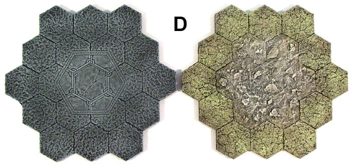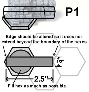 | 5. | P-type WallsThese wall sections span across the tiles from point to point. These walls bridge across the edge of hexes, covering up 1/4" of the hex they cross. This is not a problem because our hexes are slightly larger than the ones used on the actual game board so game markers and miniatures will still fit in the hexes. |