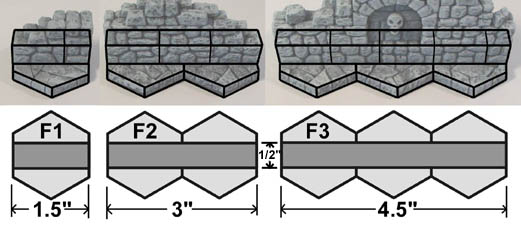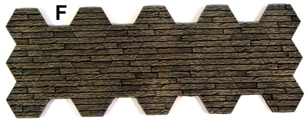 F-type WallsThese wall types span from flat to flat across the hex. There are 1/2" wide walls centered onto the hexes. If you want to expand your set beyond what is shown in these instructions, it will be easy to use any type of wall style for these walls such as rubble stone, half-timber and stucco. However, if you do create new walls for the set, it's important to not make the walls go up too high. If the walls are too tall, you will not be able to see the figures or markers on the game board to play the game. |