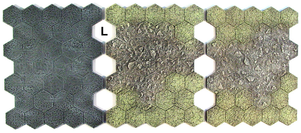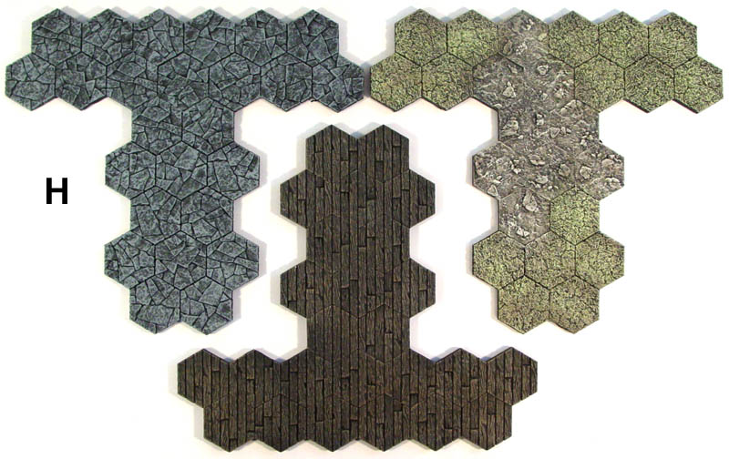 | 4. | F-type WallsThese are wall sections that span across the tiles from flat to flat. These are used to separate rooms and also form walls around the outside. These walls are the easiest to use. Since each hex measures 1.5" from flat to flat, it will be easy to construct any style of wall you want to span across the flats of the tiles. |