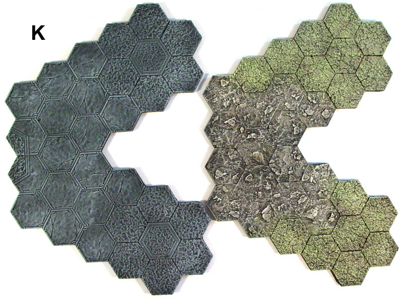 | 4. | Trimming the PiecesYou will need to trim pieces "H" and "K". Each of these pieces has an interior group of three hexes that will be too small to fit three pillars into. This happens because the hexes are an exact size and painting the pieces adds thickness. However, this is easy to fix. Take a hobby knife to trim off the paint and enlarge the holes. Then test fit pieces around it to make sure that you can fit any configuration of walls inside of these spaces easily. After you trim them out to your satisfaction, color the bare edges using a black magic marker. |