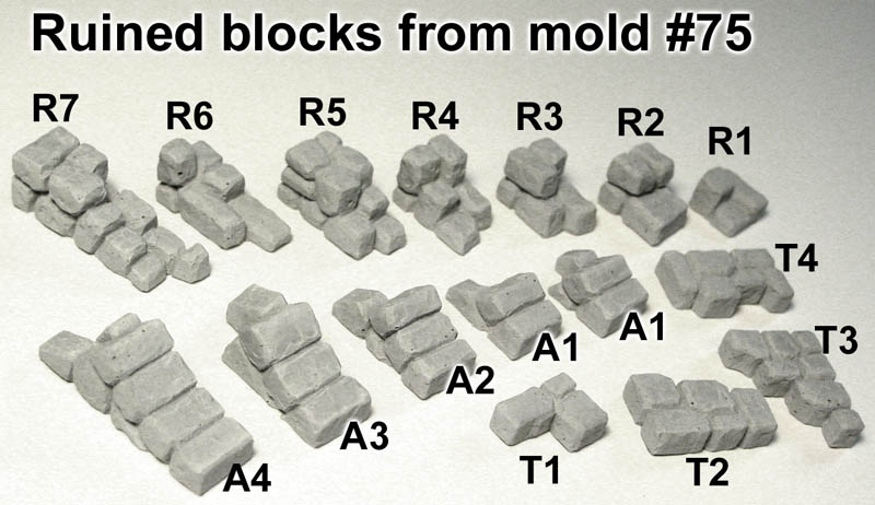 | 5. | I've included this chart to help you identify blocks from mold #75. Click on the photo for a larger view. I suggest that you print out this photo and use it as a guide when trying to pick out the blocks for each wall section. Most of the arch blocks (A1-A4) will be glued together using four blocks to make one full arch. However, there are a few wall sections where single blocks are used so do not glue all of the arch blocks together at the beginning. |