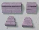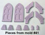 1. | To begin with, every dungeon section shown on these pages, uses mold #45 (Gothic Dungeon Builder) and mold #201 (Floor Tile Mold) as a base. You may run into a few photos and wonder "which mold are those pieces from?" If they are not labeled, then they are most likely from mold #45. This first photo shows what pieces are used from mold #41 to complete this hallway section. You will have to sand off the corners on 8 of these pieces so they will set next to each other later on. |