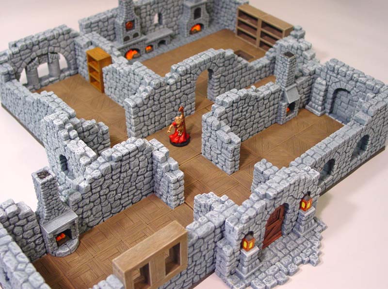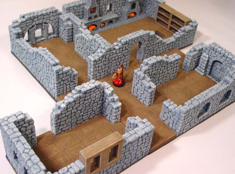 The photo above shows what the complete set I'm building will look like. There are four types of parts used in this layout. Rooms, hallways, wall ends & doorway blockers, and pillars. The photos below show just a few examples of each of these.