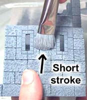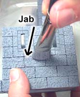 3. | To paint deep detail such as the wizard's tower faces, start by slopping the paint on. If you take a brush full of paint and scrape it across the top edge, paint will run down and cover the faces completely. Next, jab the paintbrush down into the faces and all of the cracks. The paint will be thin enough to flow into all of the gaps and spaces. |