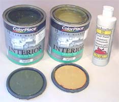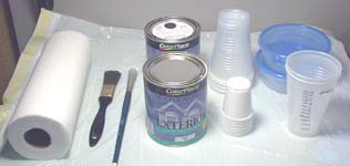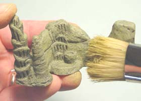 1. | To do the dry brushing properly you'll need a good quality paint brush. I cannot stress this enough! Go to your local craft or art store and spend $12 on a good 3/4" wide artist's brush. The bristles should be medium soft and about 1" long. Pour some of the medium color into a small cup. Do not thin the paint! The formula for the Water Cavern medium color is listed above. I like to tape down a paper towel to the table. This keeps it in place when I brush the excess paint out of the brush on it. |
