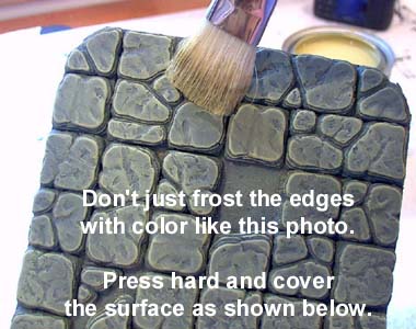 2. | Dip the brush into the paint and wipe all of the paint out on a paper towel just as we did in the steps above. This time use a very light pressure and longer strokes. This last coat will take very little paint, so if you mix more than 2 ounces it will probably get wasted. This step will frost the edges and help them to glow. It will also mute the strong color of the floor so it will look a bit more natural and not so green. Be sure that you do not jam the brush down into the face of the floor but only lightly brush across the top and edges. |