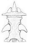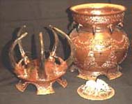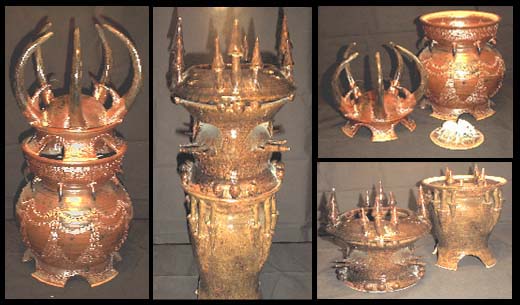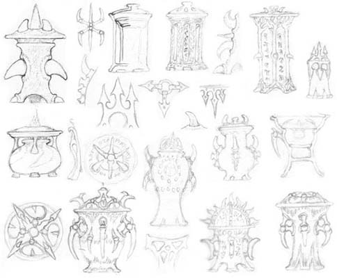 I've made a number of pieces, mostly strange tribal pots consisting of roots, horns and natural elements. I also like to have several inner chambers and decorate the inside as much as the outside. You can click on the photos on the left to see a couple of them along with some quick sketches out of my sketchbook. The trick is to find the shapes and combinations that express what you want, and arrange them in a way that works together. When designing decorative elements, I still use clay to explore different shapes and ideas.