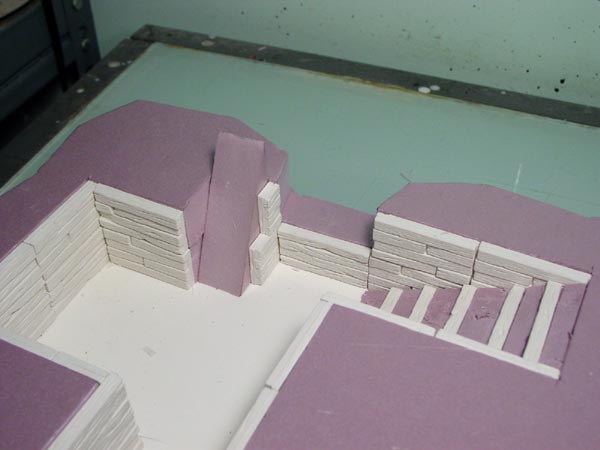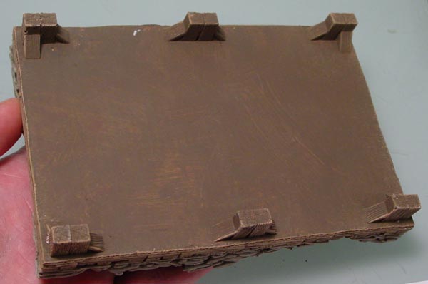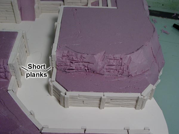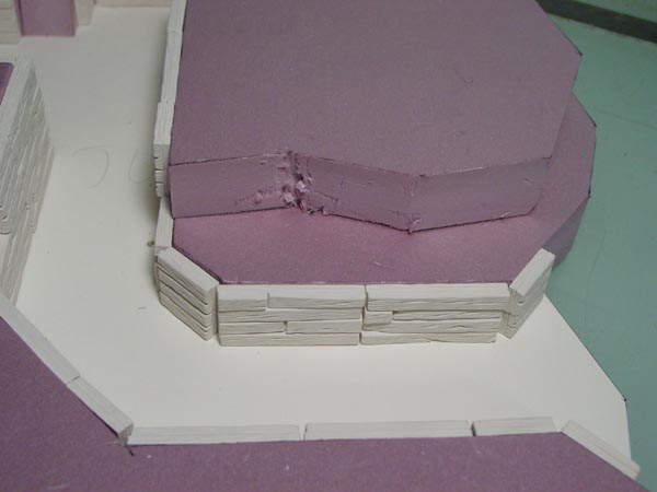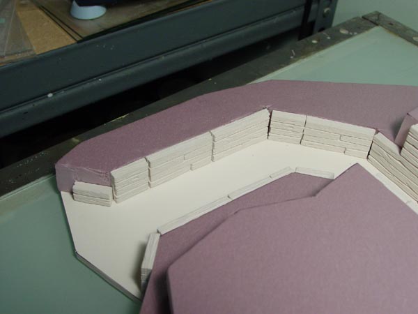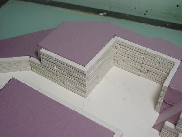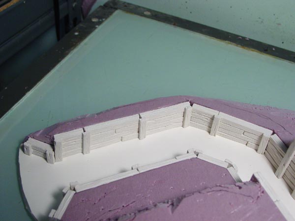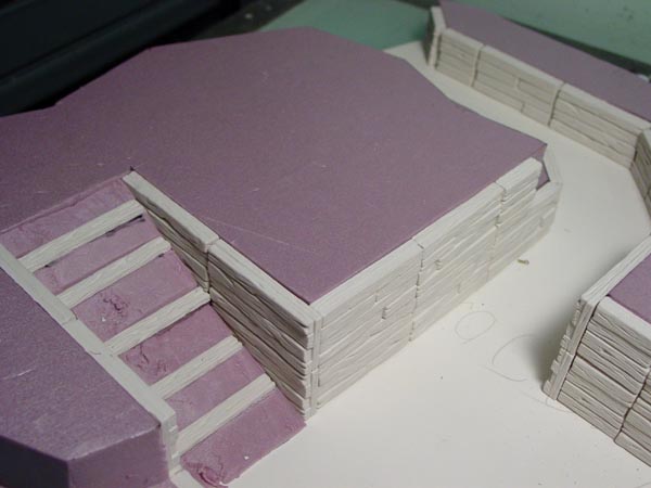 | 4. | Glue the sandbags shown on top of layer 3. Try to vary the seams a little by putting different lengths down. You may even want to butt together straight sandbags for the corners instead of using the corner pieces like I have done. |