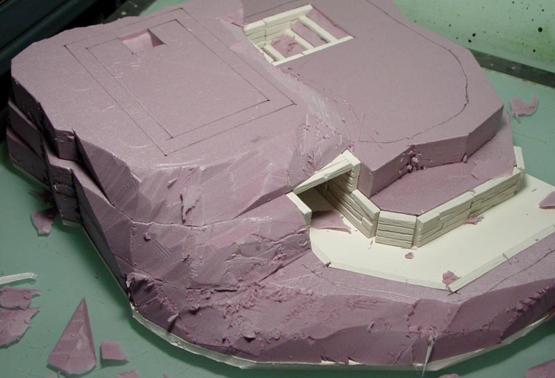 | 4. | For the steep areas, you want to cut some vertical grooves into the side of the hill. These are the areas we will end up putting a rock texture on. Be sure to vary the depth, angle and width of these grooves for a more natural look. As for the foam core base around the bottom of the hill, you will end up slicing it off while you are cutting the hill shape. |