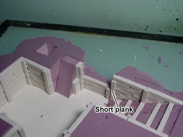| 3. | With this small ramp section now glued to layer 3, we can now add a couple of rungs to the ladder. Use a hobby knife to cut a groove and glue a 1" plank into the groove. Also add another plank halfway down underneath it. Using this same method, also add planks onto the main ramp below it. |