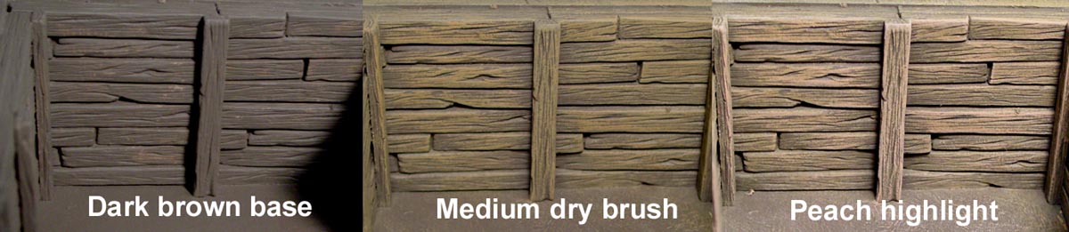 | 3. | The next step is to dry brush the medium brown onto the wooden planks and sandbags. You can find the medium brown color on our Earth Tone Colors page. For written instructions on dry brushing, be sure to look at the Dry Brushing Instructions. There will be some places where your rock faces may be close to your sandbags. In order to keep your dry brushing off of the rocks, you may have to mask some rock areas with masking tape. The blue colored paper tape from 3M is very good quality and a 2" wide roll will last you a long time. The final highlight color for the planks will be a light peach color. The color is 2 parts medium brown, 3 parts white and 1 part red. Click on the photo for a larger view. |