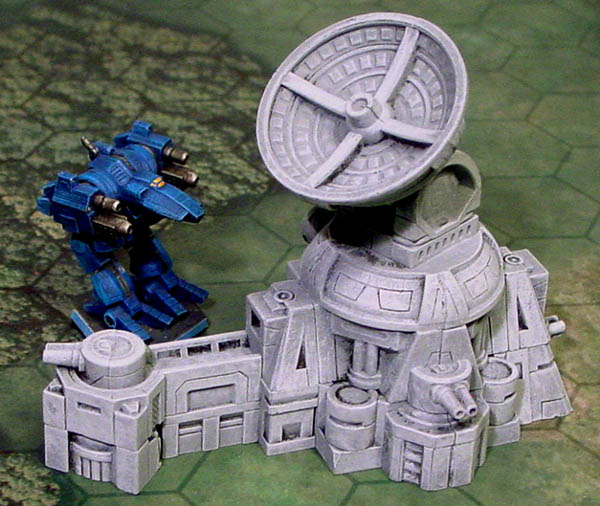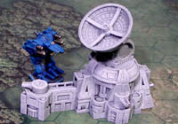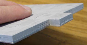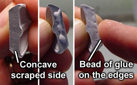Gluing the Blocks When gluing the blocks, you will notice that some have a concave side where the mold was scraped. When you have items that will be glued concave side to concave side like the small radar dish here, it's important to get the glue out to the edge of the piece. Place a bead of glue on the block and spread it to the edges of the block using your finger. |