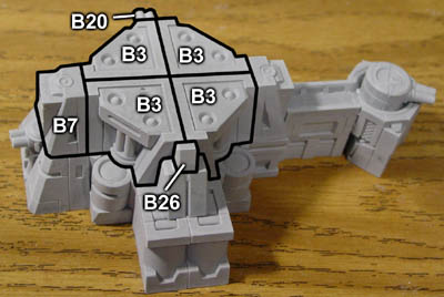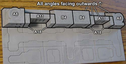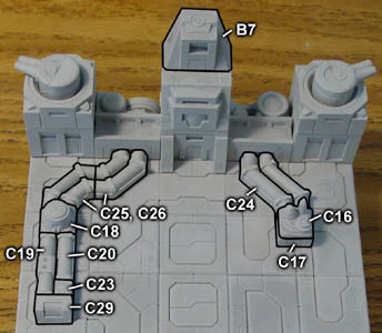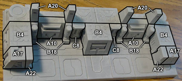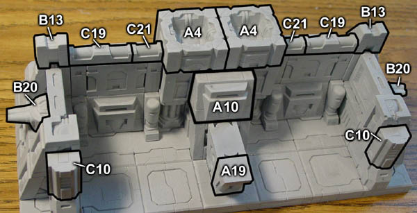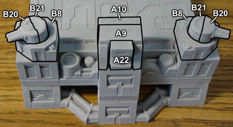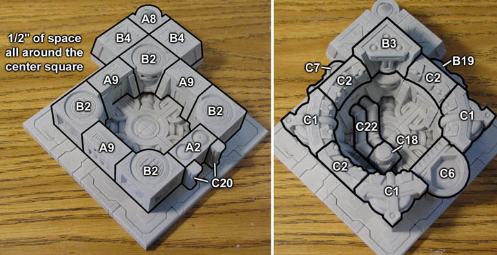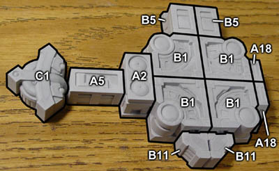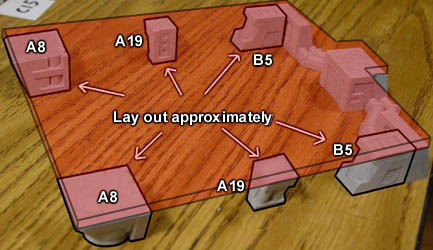 | 4. | Glue the B5 pieces onto the above assembly and lay out the following pieces approximately next to it. The large flat panel of floor tiles you glued from step 2 (above) will be glued down on top of these blocks. After gluing them down, you can slide the blocks around so the A8 blocks are directly under the corners and the A19 blocks are somewhere near the center. |