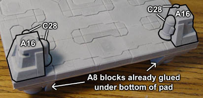 | 6. | On the opposite end of the pad, Glue on the blocks shown. You will notice that the angle on the A9 block in the center faces away from you. |