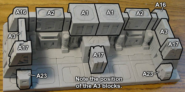 | 13. | The A17 block in the center is placed upside down. The A3 blocks are placed centered between the A16 and A17 blocks. The A23 blocks should be aligned with the blocks behind them on the inside edges. |