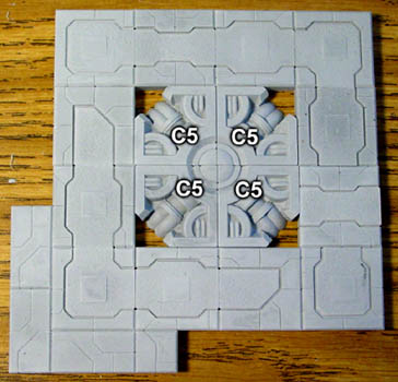 | 18. | ![]() Add these decorative blocks onto the top of the gun. Make this floor section out of the floor tiles. The C5 tiles will take the place of the floor tiles in the center. |