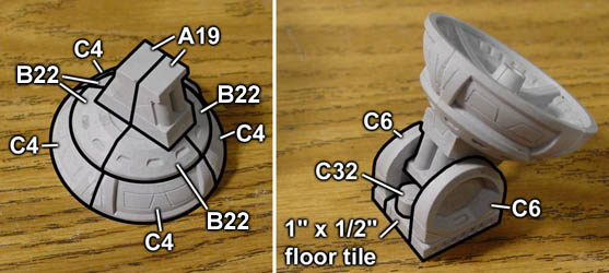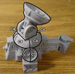 | 29. | Finish the top by adding the four C4 pieces. These are placed upside down to form the turning base of the large dish. Add the C3 small radar dish onto the B26 block and position it as best you can. The large radar assembly from step 25 is placed on top any facing you like. I would suggest gluing it on top because it may be a bit unbalanced depending on how far down you angled the main dish. |
