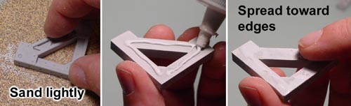 Many of these pieces will be glued back to back. This is the best method to get a strong glue joint. Start by lightly sanding the back side of the blocks. Then place a bead of glue on the back. Spread the glue towards the edges using your finger. Since the outside edges of the blocks will be slightly higher than the center, that's where you need to put the glue. |
