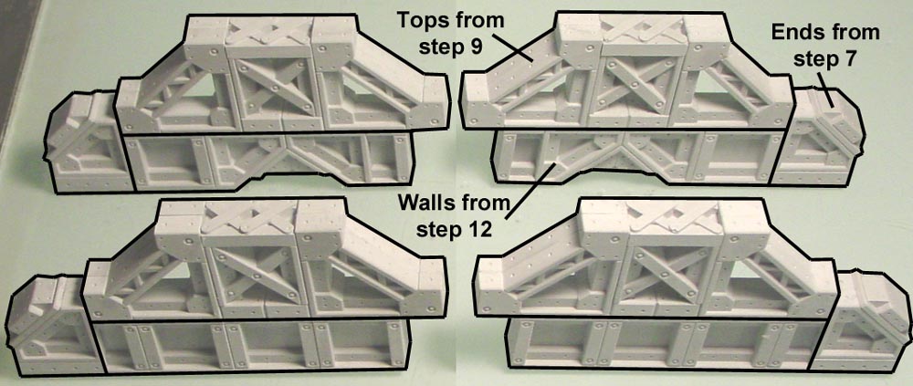 15. | Using most of the pieces we've assembled so far, glue them together to make these four bridge side pieces. Click on the photo below for a larger view. |