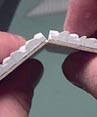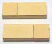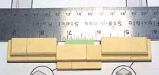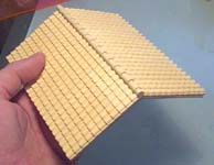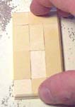 5. | The third layer (with the floor) will be made of top trim blocks. It's very important that these blocks are smooth on the scraped side. Place a group of blocks next to each other and find the shortest block. Lightly sand the bottom of the block until the scraped side is smooth. Next, take each block, set it next to the short one and feel the top. It should feel a little higher. Take the block to a piece of fine sandpaper and lightly sand the bottom. Now compare the height again. Continue doing this until the blocks feel the same height. |