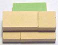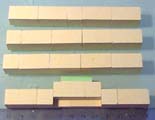 3. | The second row consists of regular smooth blocks (first photo). Be sure to stack and glue these with the scraped side down. Or if you want to, you can lay them all on their sides. Just be sure the blocks are the same height. This section also has steps made of the regular flat tiles. Again, do not glue the pieces shown in green. The next photo shows the separate sides glued together. The last photo shows the finished layer. |
