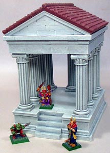 11. | Here are a few other shots of the temple. The miniatures that are used for statues are 25mm, slightly smaller than the Warhammer figures. This ends the instructions for the Temple. If you would like to add a tile roof to the temple, continue reading below. |