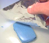 | 7. | Remove the paper design and pour some glue onto the foil. You don't need a lot of glue, just enough to give a thin coating over the design. The glue will settle down into the grooves and dry there, making the dents in the foil permanent. Leave this a couple of hours or until the glue dries completely. In the meantime, roll out another piece of clay and work on the next design on the sheet. |